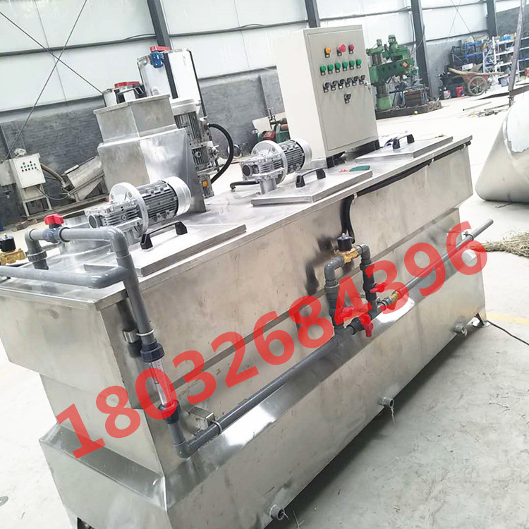 配制溶液从配制槽经熟化槽再进入储存槽,当储存槽液位处于高位时,配制过程自动停止,当溶液下降到低液位时,自动启动配料过程。配制槽和熟化槽均设置搅拌器,充分保证药剂的稀释和熟化。配制流量及浓度可通过调节进水流量和调节螺旋轴转速来确定。