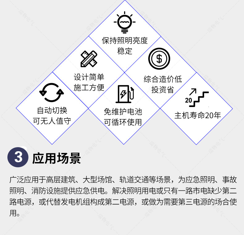 采用***微处理器控制,正弦波供电,稳压、稳频。 无噪音,无公害。 ***,节能,数字化EPS效率高达90%以上。