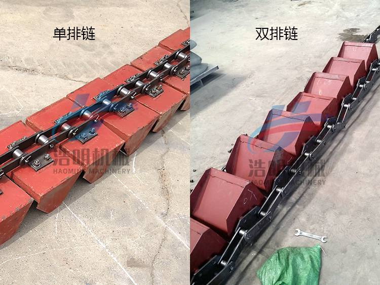 NE30斗式提升机为单排链样式,链条安装在料斗的中间位置,两个折弯外链板正好四个孔,对着料斗的四个孔。