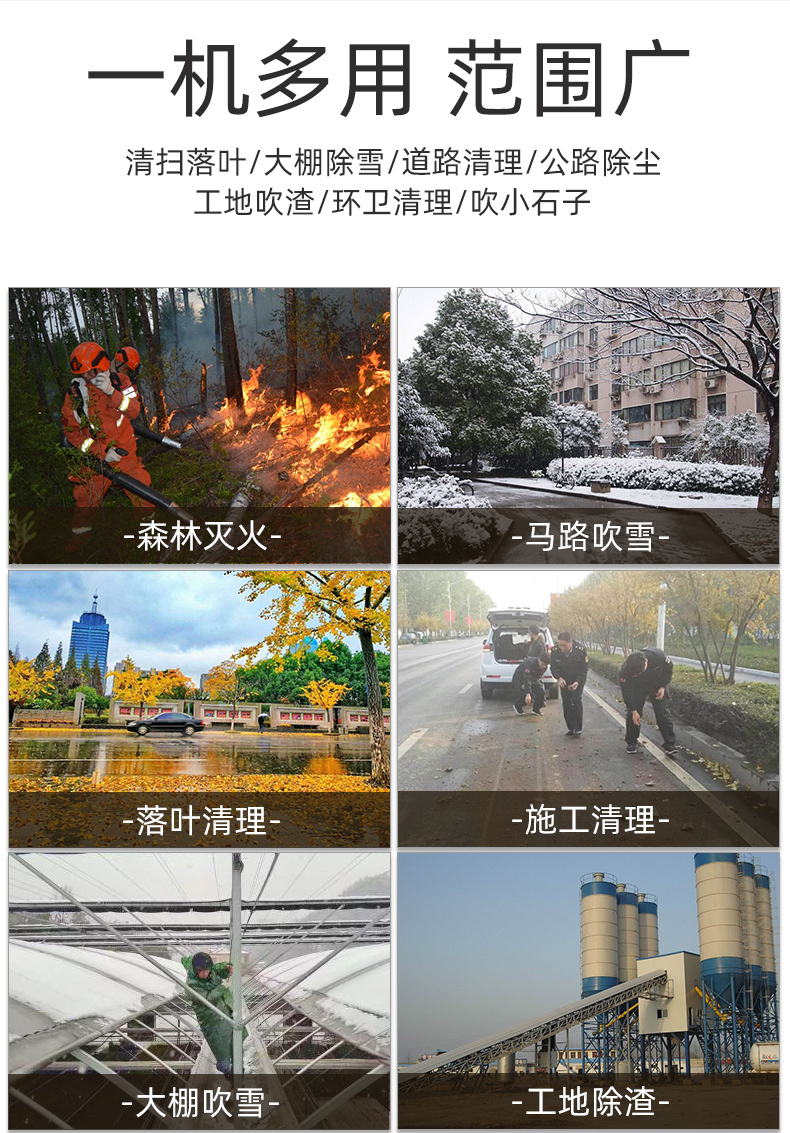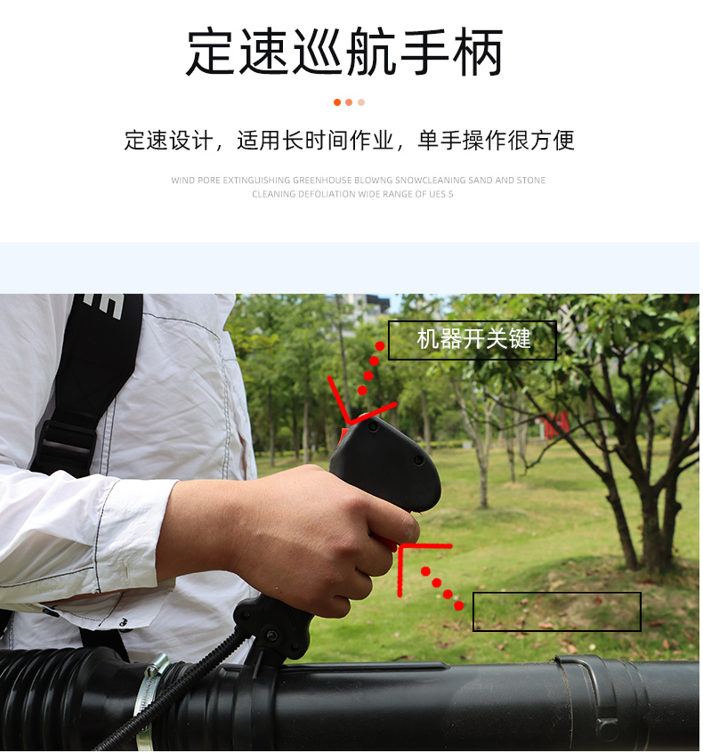风力灭火机是由qi油发动机和风动机构两部分组成。qi油发动机是风力灭火机的动力源。qi油机的输出轴直接与风动机构的风轮联接,发动机高速旋转时协同进气口、风壳和出气筒,产生高速气流把燃烧时释放出的热量带走,使温度降到燃点一下,或通过吹散燃烧物,减少可燃物存在量。从而达到灭火的效果。