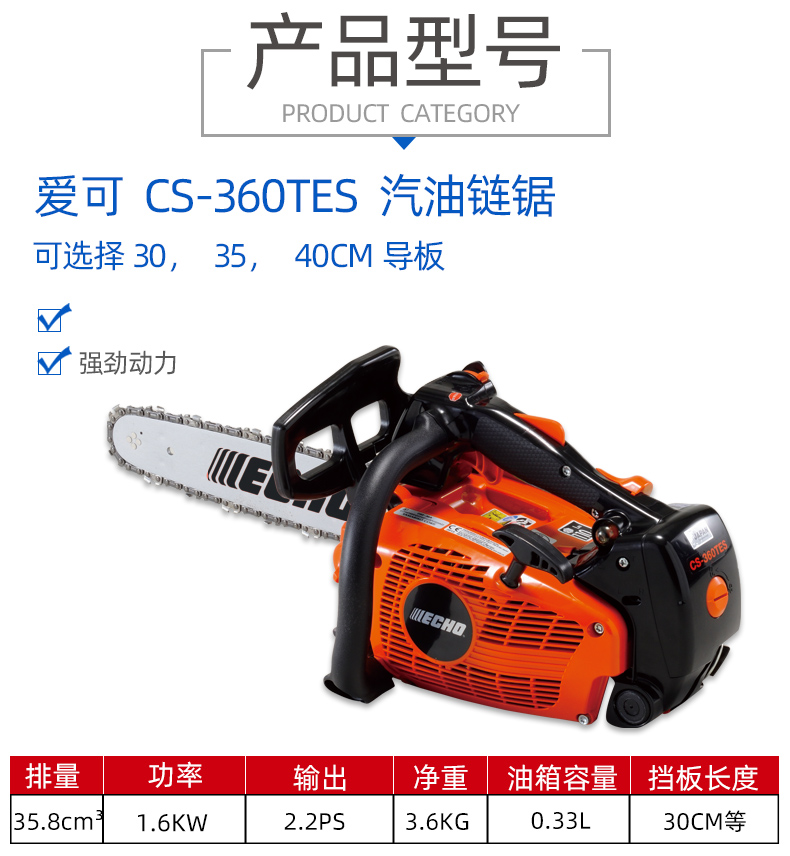 爱可CS-360TES油锯ECHO链锯森林伐木机