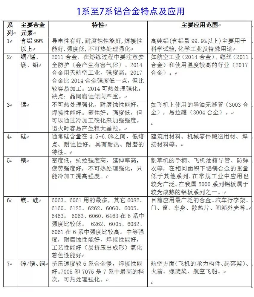 纯铝用于工业生产并不常见。纯铝比较软,在纯铝中添加各种合金元素,可以生产出满足各种性能和用途的铝合金。我们生活中常见的铝制品都是铝合金材质。铝合金本身分为7个系列,也就是常说的铝牌号。不同系列的铝合金,其中的合金成分、比例均不同,所应用的领域也不同。
