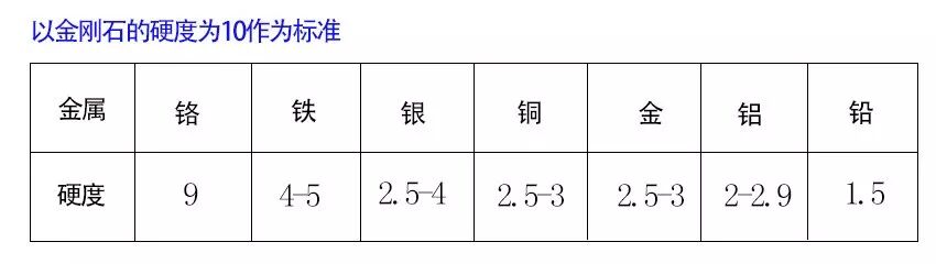 铝,银白色 轻金属,有延展性。它的硬度是2-2.9,与其他金属元素硬度相比,如下图所示: