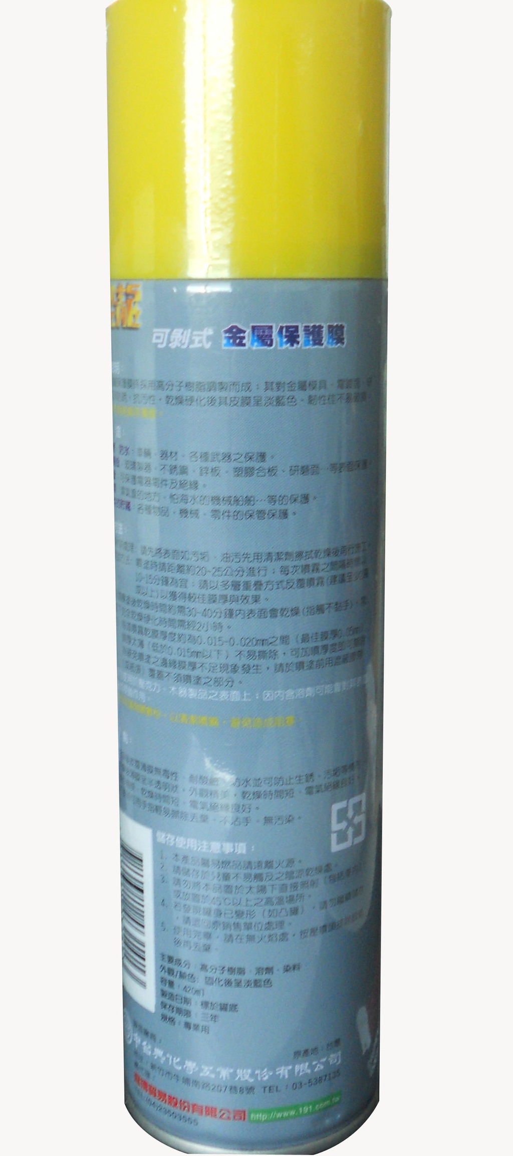 主要成份:高分子树脂、溶剂、染料外观颜色:淡蓝色或透明状规格:***用容量、包装:420ml、12 罐/箱商品尺寸:6cm*6cm*24.4cm 恐龙可剥式金属保护膜系采用聚乙烯醇缩丁醛高分子树脂、醇、苯类溶剂、推进气等调制而成,对金属模具、金属机械制品之电镀面、研磨面等具防锈性、抗刮性、抗污性,干燥硬化后其皮膜呈淡蓝色或半透明、韧性佳不易破损;不要时薄膜亦可轻易被撕除丢弃。 性质: 1、(油性)不溶于水。 2、外观/颜色:呈淡蓝色或半透明粘稠液体。 3、比重(20℃):约0.795~0.805之间。 4、燃烧性:强燃性,请远离火源及高温场所贮存放置。 5、稀释溶剂:醇类、苯类等***。 用途说明: 1、防锈、防水:车辆、器材、各种***之保护。 2、防损毁:玻璃制器、不锈钢、锌板、塑料合板、研磨面…等表面保护。 3、绝缘:可保护电器零件及绝缘 4、防湿:湿气重的地方、怕海水的机械船舶…等保护。 5、零件的贮存:各种物品、机械、零件的保管保护。 适用:对金属模具、金属机械制品等表面形成良好之淡蓝色或半透明皮膜,具优良保护作用。不要时可用手指轻易的撕除。 使用方法: 1、基材前处理:请先将被涂布物表面如沾有污垢、油污可先用清洁剂、酒精溶剂擦拭并待其干燥后再行施工。 2、喷涂方法:喷涂时请距离约20-25公分进行喷雾;每次喷雾之间隔时间应以10~15分钟为宜;请以多层重叠方式反覆喷雾(建议至少2遍或以上)以获得较佳膜厚并达到更好保护效果。 3、每道喷涂后干燥时间约需30~40分钟内表面会干燥(即指触不黏手);常温下完全干燥硬化时间则需经2小时或以上 。 ***注: 每道喷雾干膜厚度约为0.015~0.020mm之间,***佳膜厚为0.05mm,膜厚太薄(低于0.015mm以下)不易撕除,可加喷厚度即可撕除。为避免喷涂之边缘膜厚不足现象发生,请于喷涂前用遮蔽胶带或纸张覆盖不须喷涂之部分。 4、请勿使用于压克力、木器制品之表面上;因内含溶剂可能会对其表面形成侵蚀作用。 5、使用完请倒喷数秒,请清洁喷嘴,避免造成阻塞。 优点: 1、干燥后披覆薄膜***性、耐酸硷、防水并可防止生锈、污垢等情形。 2、干燥后薄膜呈淡蓝色或半透明状,外观精美,干燥时间短、电气绝缘良好。(透明度视施工当时空气湿度高低有所差异) 3、不要时可用手指轻易撕除丢弃、不沾手、无污染。 注意事项: 1、本产品属***品,请远离火源。 2、请存放于儿童不易触及之阴凉干燥处。 3、请勿将本品置于太阳下直接照射(包括车内)或放置于45℃以上之高温场所。 4、若发现罐身已变形(如凸罐),请勿继续储存,请退回原销售单位处理。 5、使用完毕,请在无火焰处,按压喷头排除余气后,再交由资源回收人员处理。