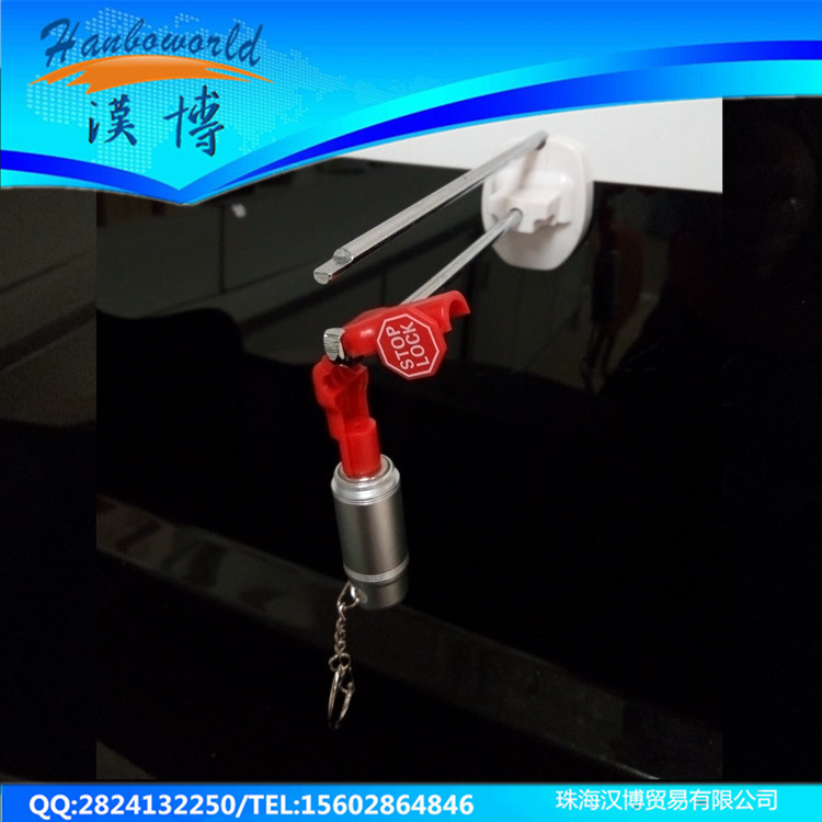 防盗原理:防盗挂钩锁是用来固定在商品挂钩的前端,起到锁的作用,从而使商品无法从挂钩上取下。