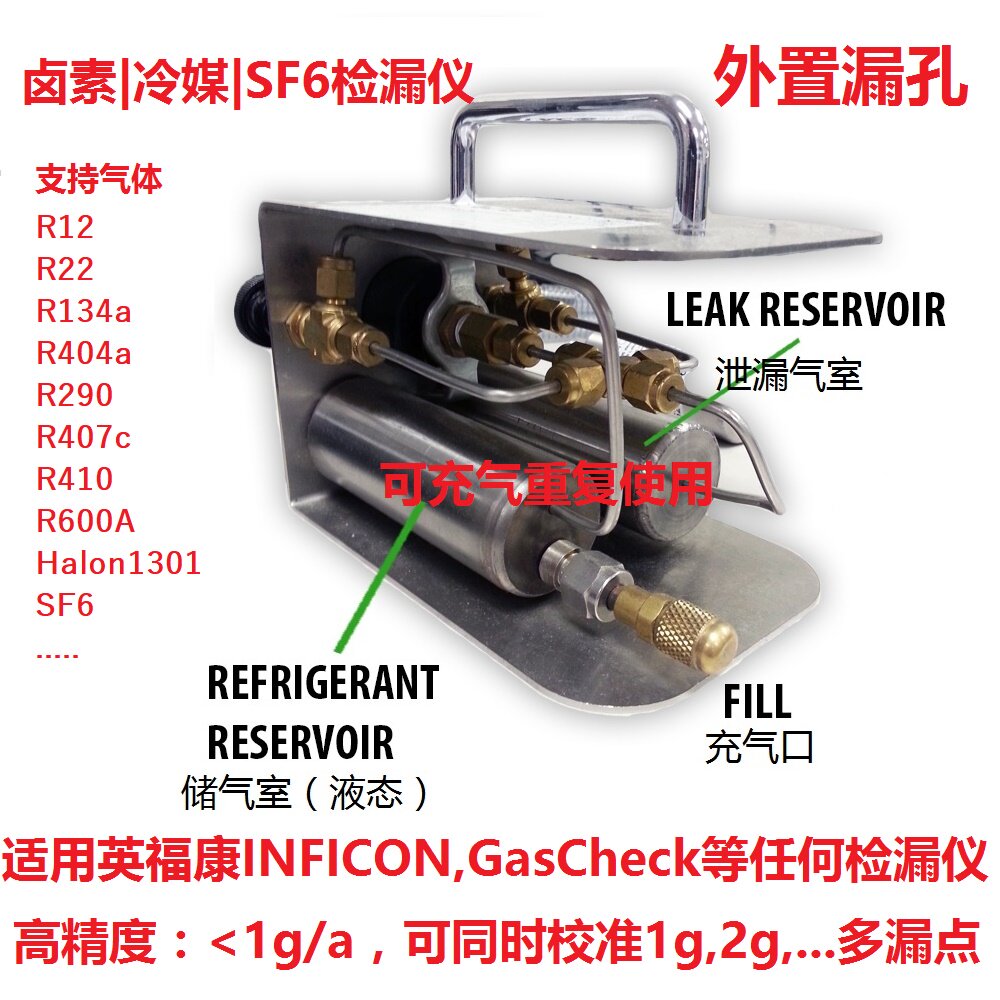双气室设计:一个气室存储液态冷媒+泄漏气室;可通过调节阀门精确控制漏率。每一个漏率点美国计量局NIST A2LA证书。 该设计适合任何冷媒卤素检漏仪包括英福康、雷格等,支持R12、R22 、R134a、 R404a、 R290 、R407c 、R410 、R600A、Halon1301、SF6